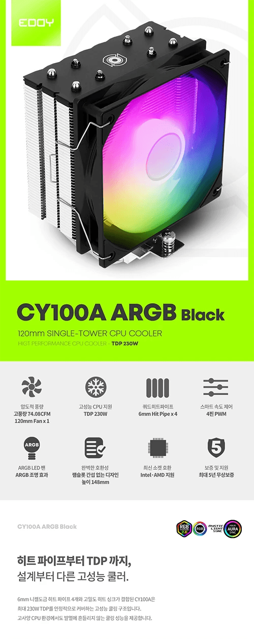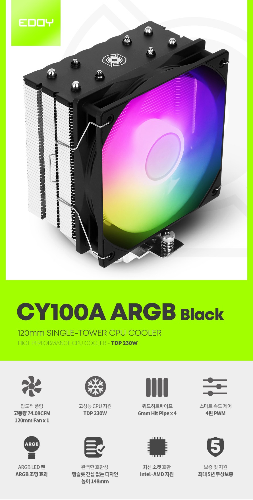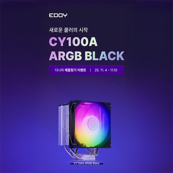 에디 CY100 CPU 쿨러는 하드웨어 커뮤니티 ‘쿨엔조이’ 벤치테스트에서 공랭싱글타워 부문 최저 온도를 기록하며 성능 1위를 차지했습니다. (25년 8월)